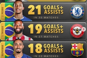 体育资讯2月16日讯 数据网站Score90盘点了本赛季五大联赛球队巴西球员在各项赛事直接参与进球榜,具体如下(进球+助攻):