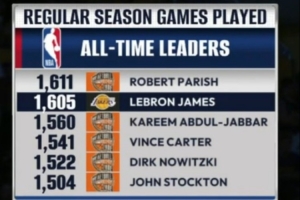 詹姆斯已经出战1605场常规赛历史第二,距离第一的帕里什只差6场。