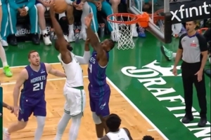 终于泄泄愤!杰伦·布朗突破蓄力起飞 单臂暴力隔扣迪亚巴特!