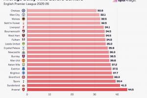 Opta统计2025/26赛季英超各队角球前平均延误时间