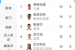 本场比赛格林伍德打进全场唯一进球,在目前的法甲射手榜上,格林伍德24场打进15球位居首位。