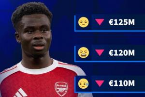 表现下滑!德转预热萨卡身价最低跌至1亿欧,周薪超30万镑队内第1