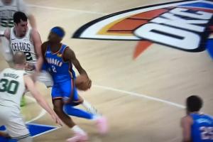 比赛中,SGA在一次合球挂手臂造成犯规后,杰伦·布朗当即对裁判表示:“这不是篮球。”