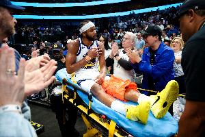 赛后勇士记者Nick Friedell报道,穆迪目前已经从X光检查室中出来,膝盖上戴着厚厚的护具,在队医的陪同下拄拐一瘸一拐返回了更衣室。