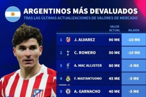 体育资讯4月17日讯 德国转会市场更新了球员的身价,列出了阿根廷球员身价下跌榜,阿尔瓦雷斯、罗梅罗下跌1000万欧最多。