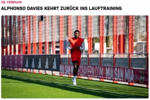 体育资讯2月26日讯 拜仁官网发文,确认边后卫阿方索·戴维斯恢复跑步训练。